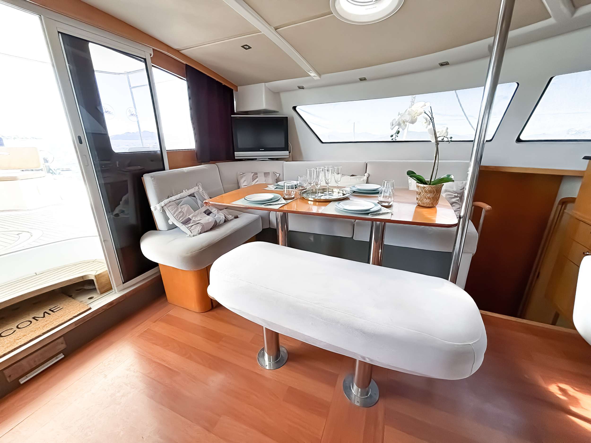 NOTABLE FEATURES OF ZORBA CAT: ~Leisurely sailing catamaran ~Al fresco entertainment space ~Sunbathing on the roof ~Air conditioning ~WiFi