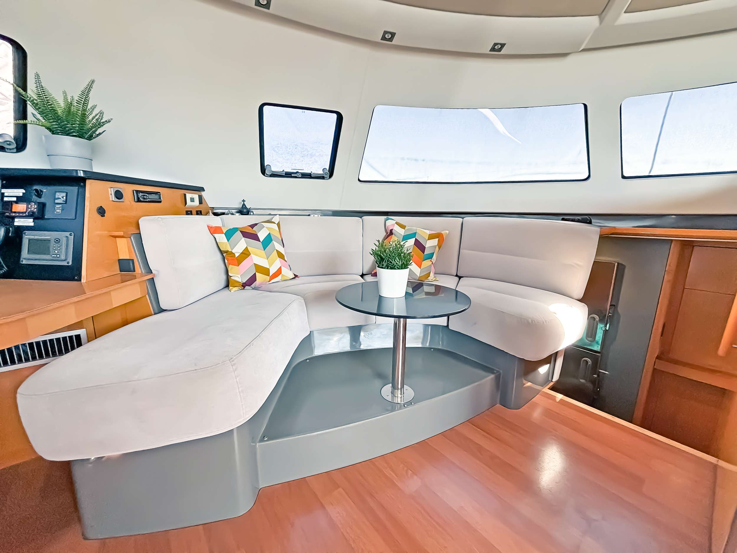 Guest comfort is at the heart of the interior layout and includes a generous salon and well-equipped galley. The open plan space is perfect for families and includes a dining area and plenty of seating to relax inside.