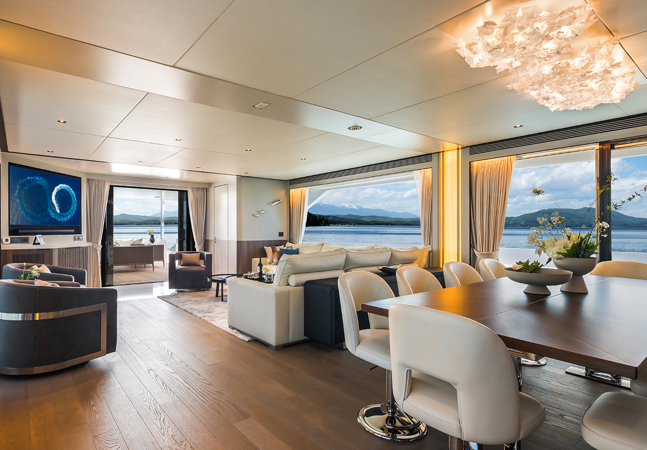 The main salon is configured with a corner sofa and other occasional chairs aft and a 10-seater dining table aft. The semi open galley is great for families or those who enjoy interacting with the chef plus the dining table can be folded and the chairs raised to become bar stools at the galley bench.