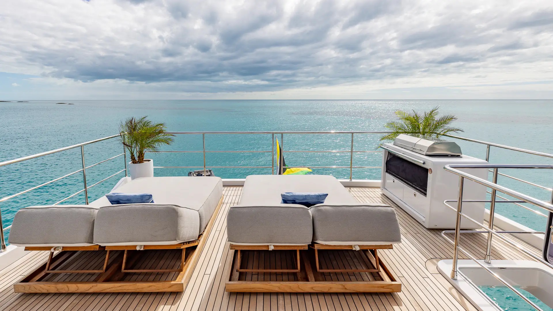 The retractable sunroof makes the flybridge a very flexible space making it usable whatever the weather and if guests prefer full sun or relaxing in the shade. There is a full sit up bar where guests can kick back with a cocktail while the Chef prepares lunch on the barbeque.
