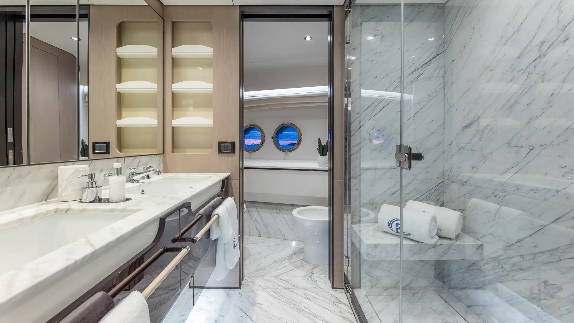 A spa-like ensuite is forward down a small set of steps and features marble and a large rainfall shower. The four additional staterooms are on the lower deck and configured as two VIPs, a twin cabin to port and another double to starboard. All the suites benefit from the luxury and privacy of ensuite bathroom facilities.