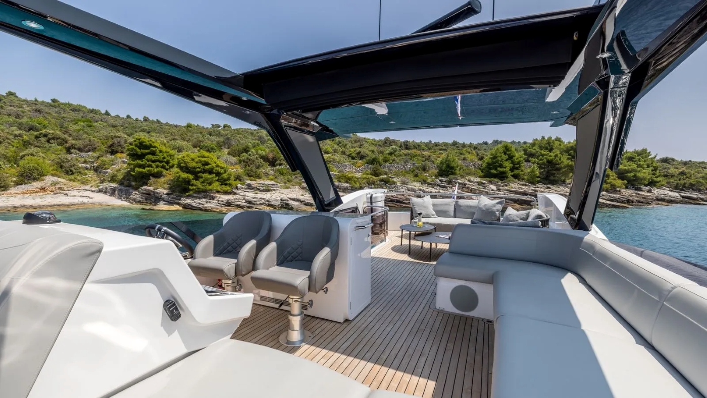 Another dining setting is available on the main deck aft and once the doors to the main salon are open, creates one large entertainment space. Steps lead down to the high-tech beach club platform which includes a beach bar and charging for water toys.
