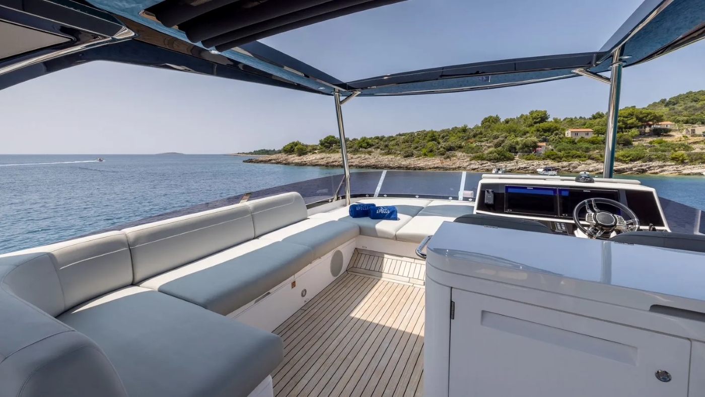 The fully equipped aft galley is integrated into the salon and is adjacent to a large dinette which seamlessly flows to the cockpit via full width sliding doors. Forward in the main salon is a cosy lounge space with a u-shaped sofa and TV cabinet, while further forward are the helm controls.