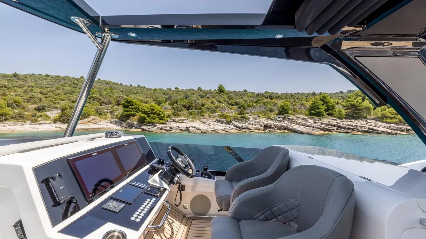 Forward in the main salon is a cosy lounge space with a u-shaped sofa and TV cabinet, while further forward are the helm controls.