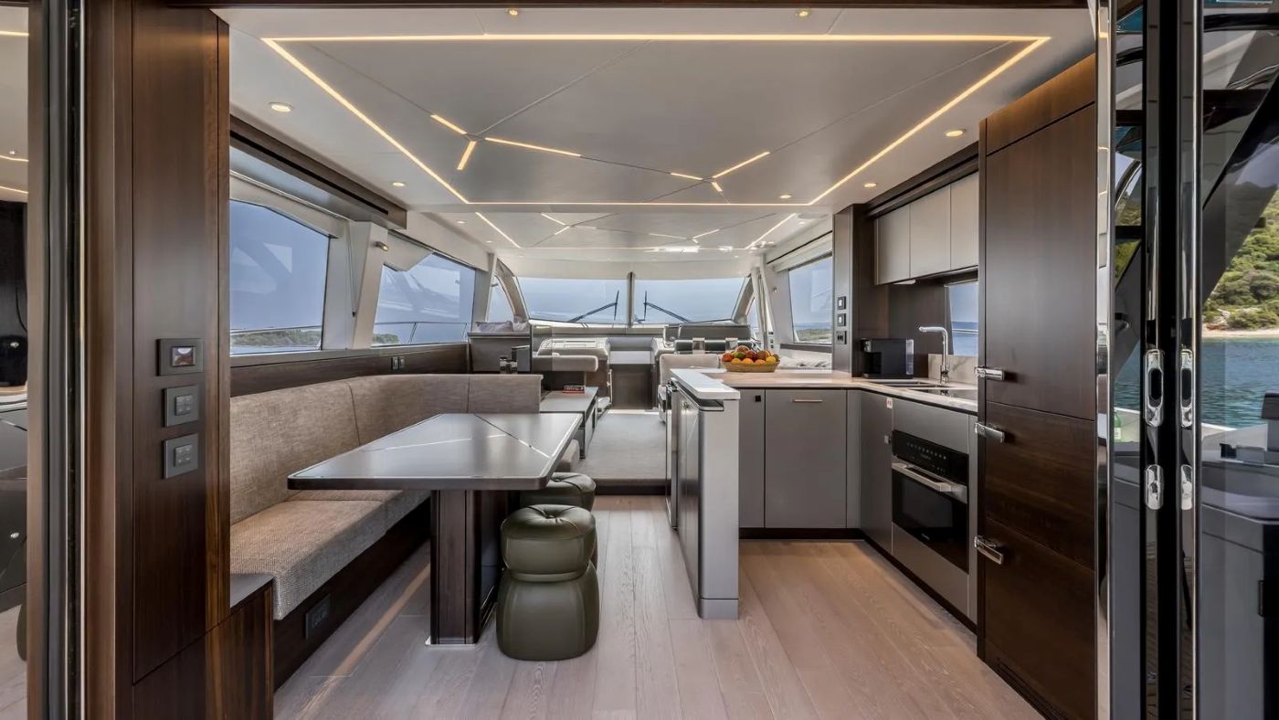 The flybridge has a hard roof with retractable section creating a flexible al fresco entertainment space.