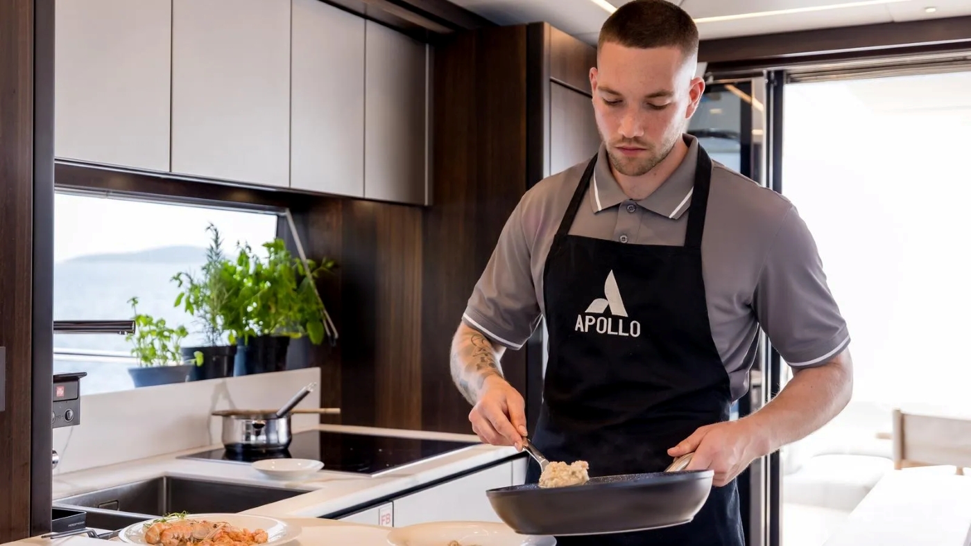 The fully equipped aft galley is integrated into the salon and is adjacent to a large dinette which seamlessly flows to the cockpit via full width sliding doors. Forward in the main salon is a cosy lounge space with a u-shaped sofa and TV cabinet, while further forward are the helm controls.
