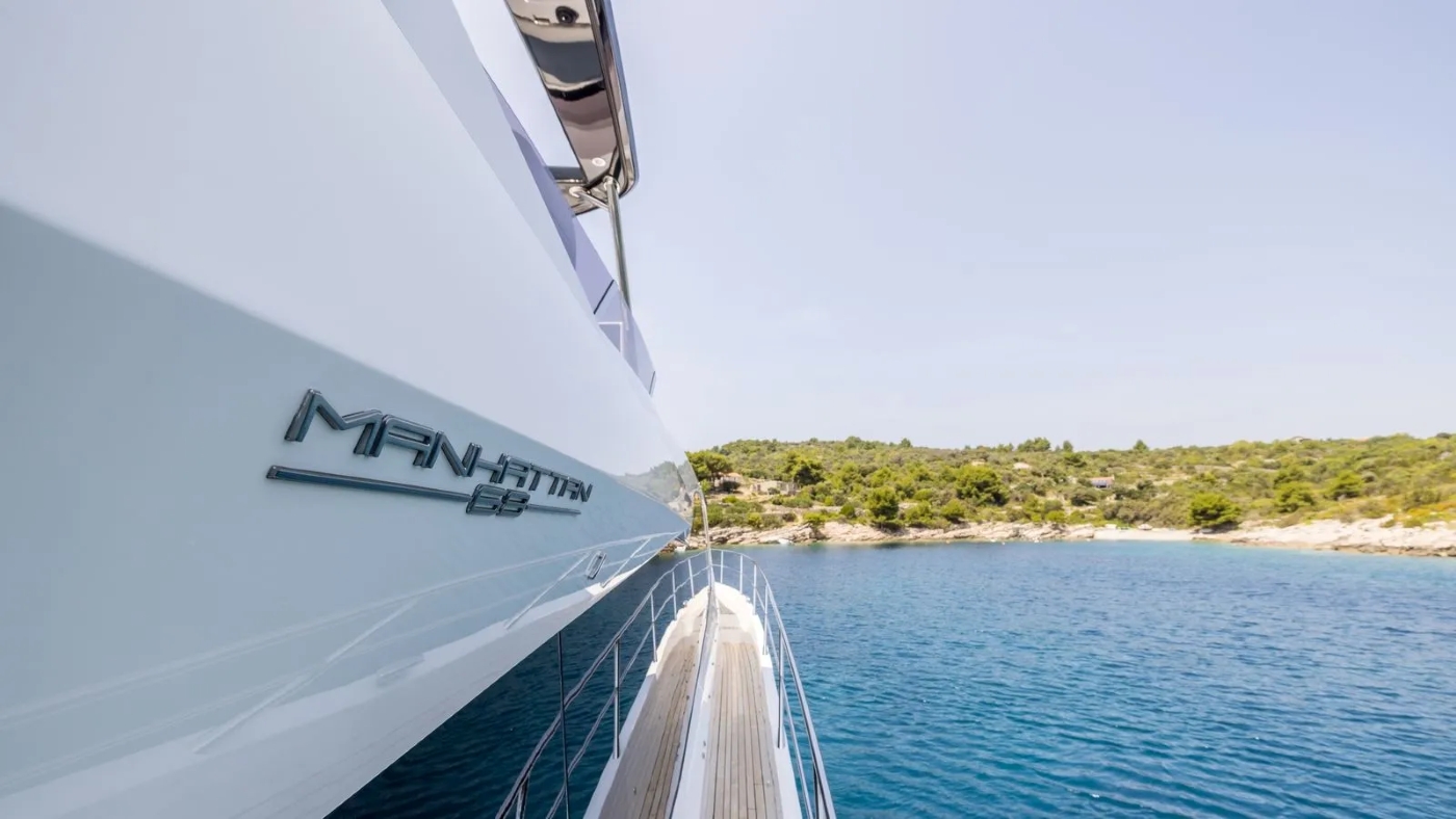 The foredeck is a sociable space on the bow with a flexible table surrounded by sofa seating and a double sun pad. Another dining setting is available on the main deck aft and once the doors to the main salon are open, creates one large entertainment space.