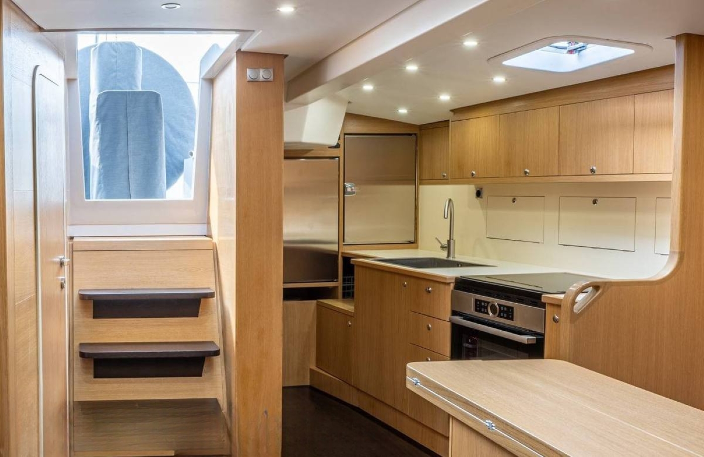 The main salon has two table settings: one large L-shaped sofa surrounding a fold away table and another banquette with two opposing sofas and table. The décor is tidy and simple with wood panelling and blue soft furnishings.