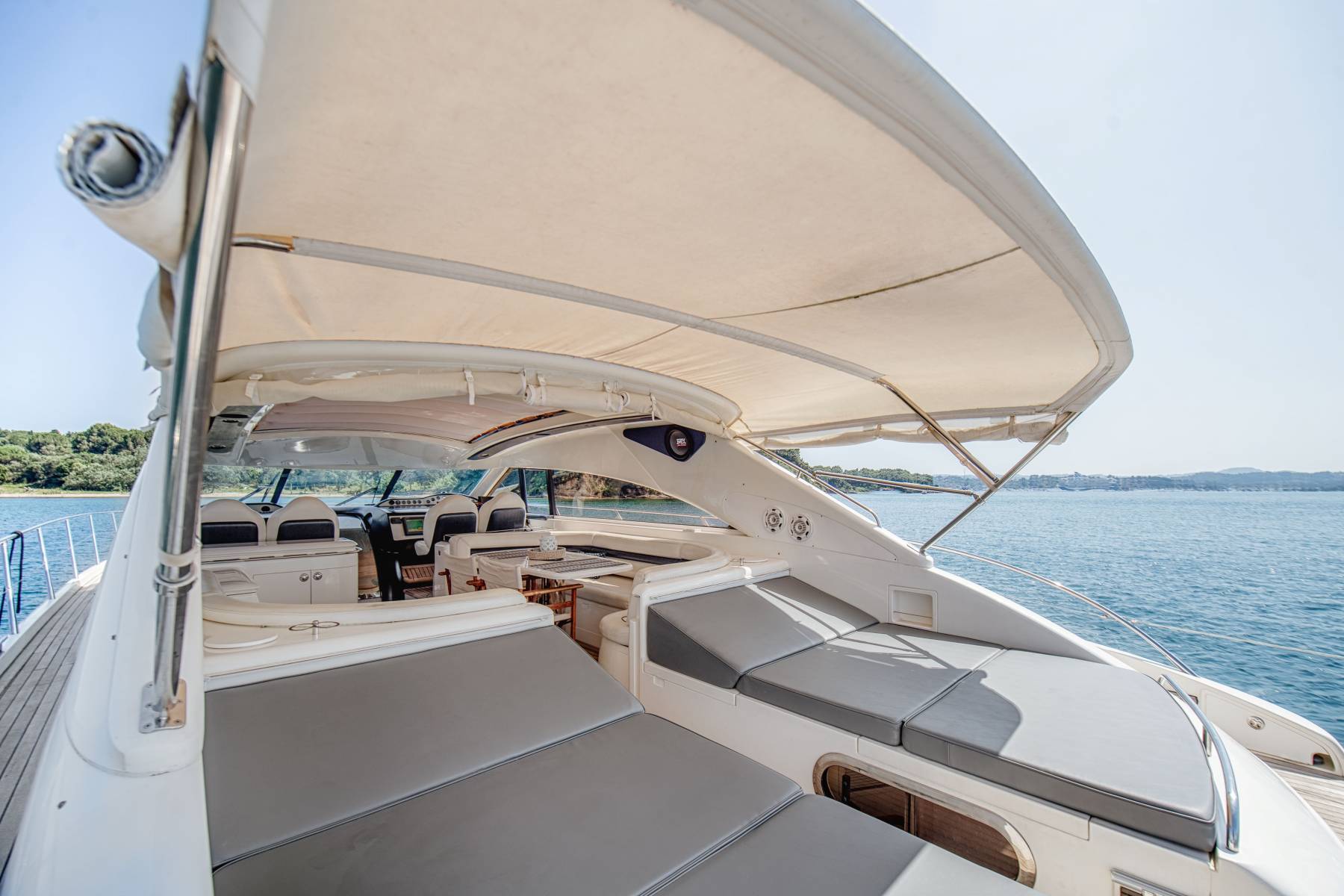 The main cockpit is a sociable area with two aft sun pads which can be covered with a bimini shade if required.