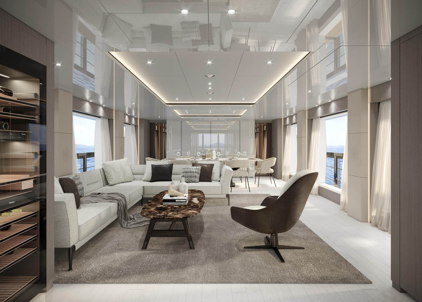 On the sundeck there is a lounge, dining setting and bar under the hard roof and a row of sun beds on the open aft zone. Side decks lead around to the bow where a foredeck lounge and generous sun pads are fitted across the split-level area.