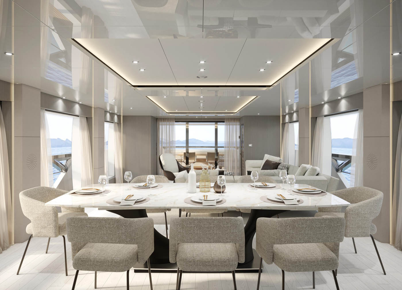 The main deck aft hosts a cosy dining setting sheltered by the flybridge overhang which leads down steps to the water’s edge where the transom door opens to create a generous beach area.