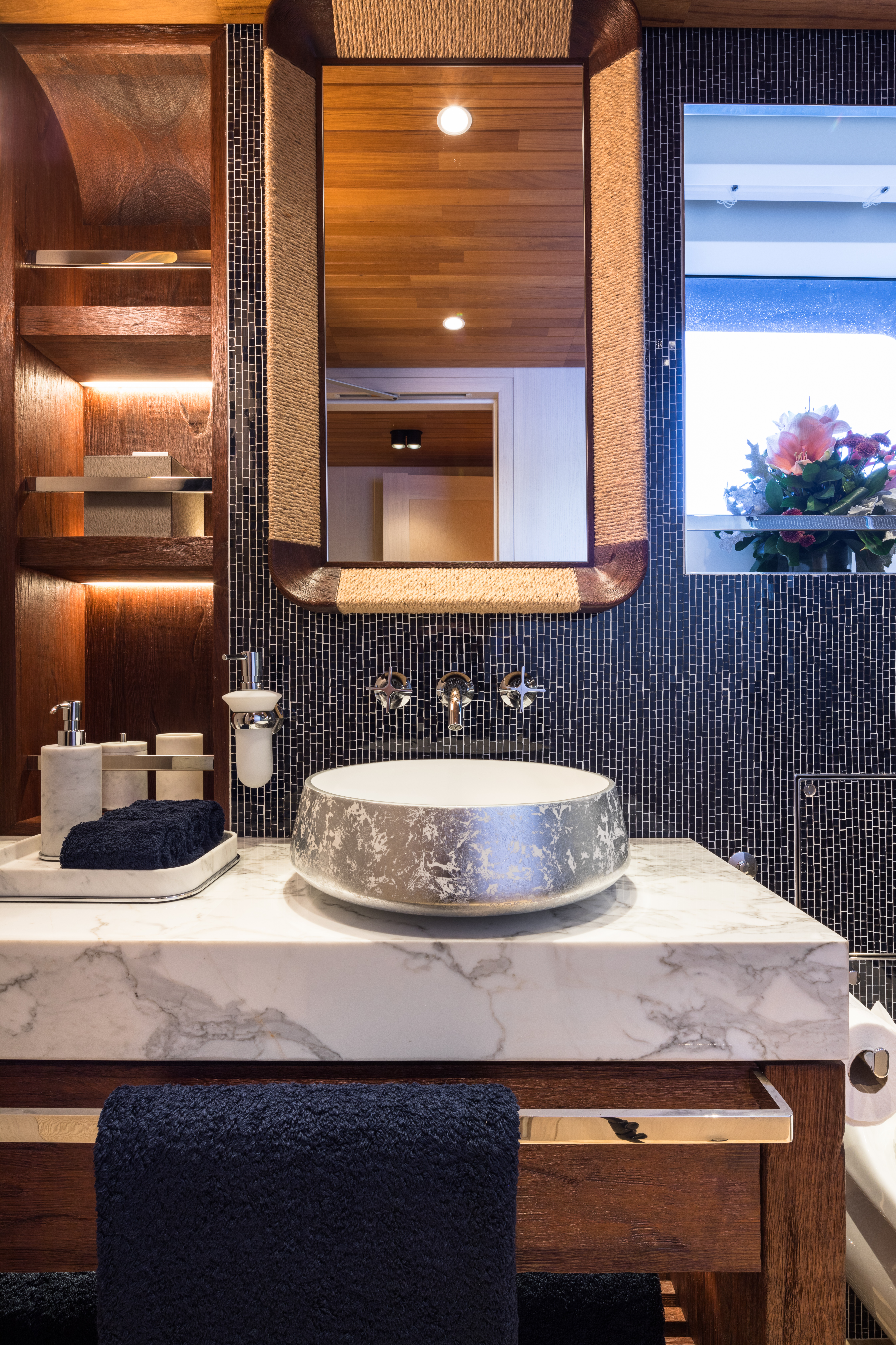 All beautifully decorated with the same aesthetic seen across the rest of the yacht, the cabins also include luxury ensuite bathrooms.