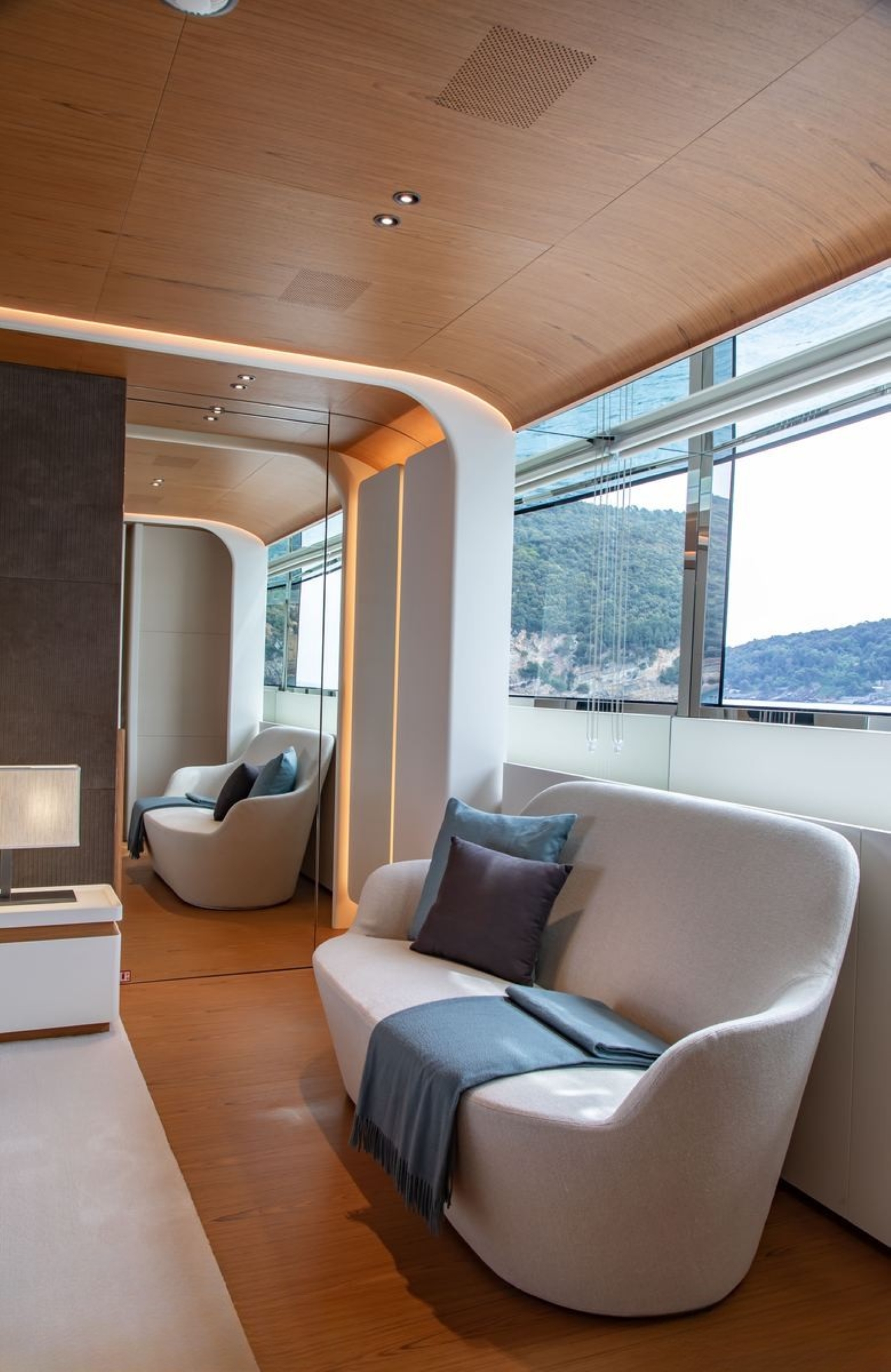 This wonderful yacht offers three main deck levels plus a sky-high observation deck with 360-degree views thanks to the glass balustrade which can be enjoyed from the plush sun pads.