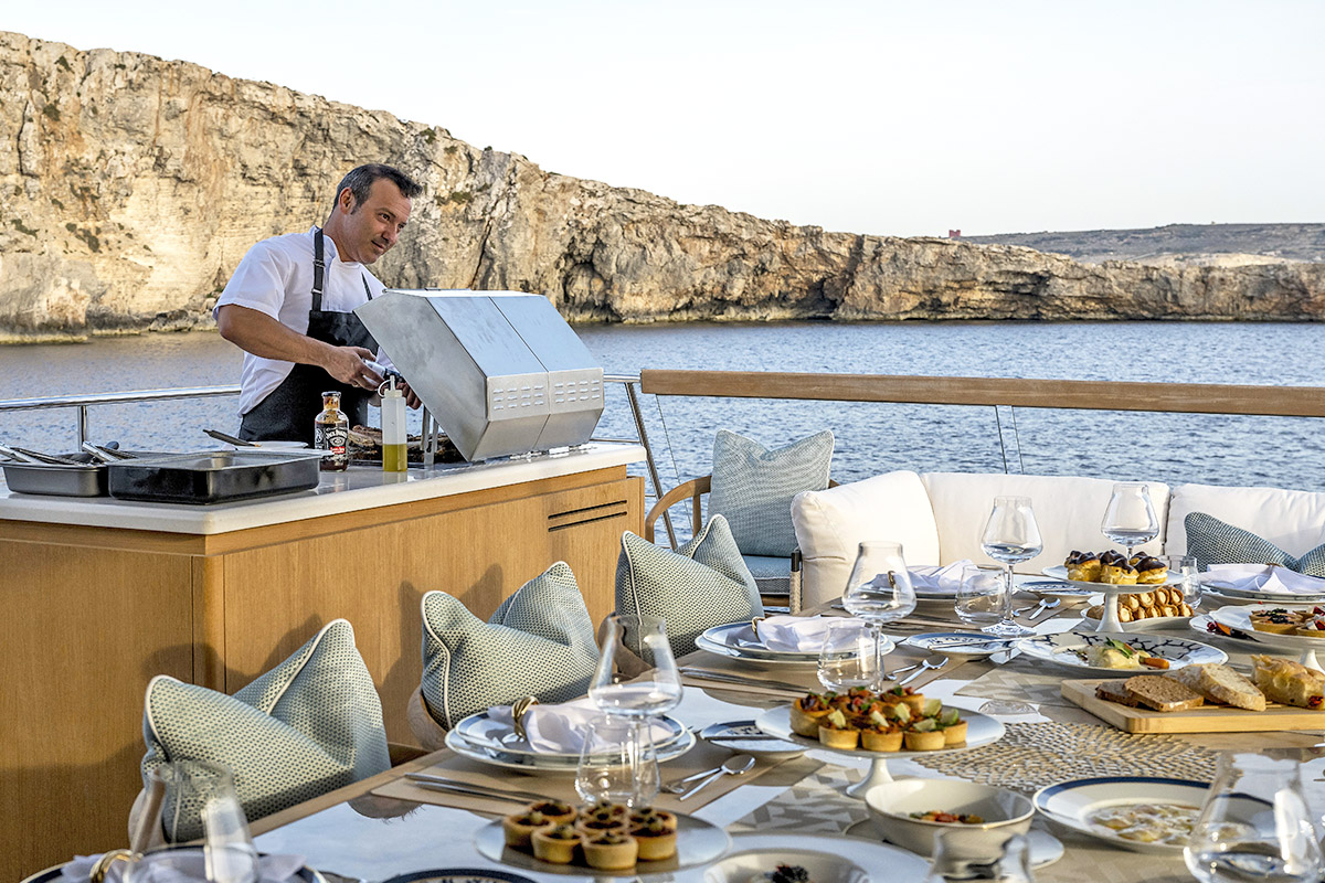 The upper deck is dedicated to al fresco dining where a long table can seat everyone on board in comfort. Sofas placed aft provide the perfect hang out for pre-dinner drinks or to relax after a tasty dinner.