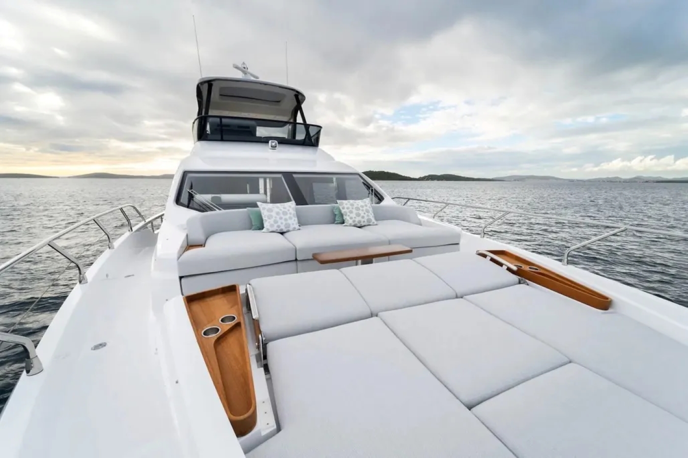 There is a choice of entertainment space on the flybridge and main deck including dining, lounge and sunbathing spaces.