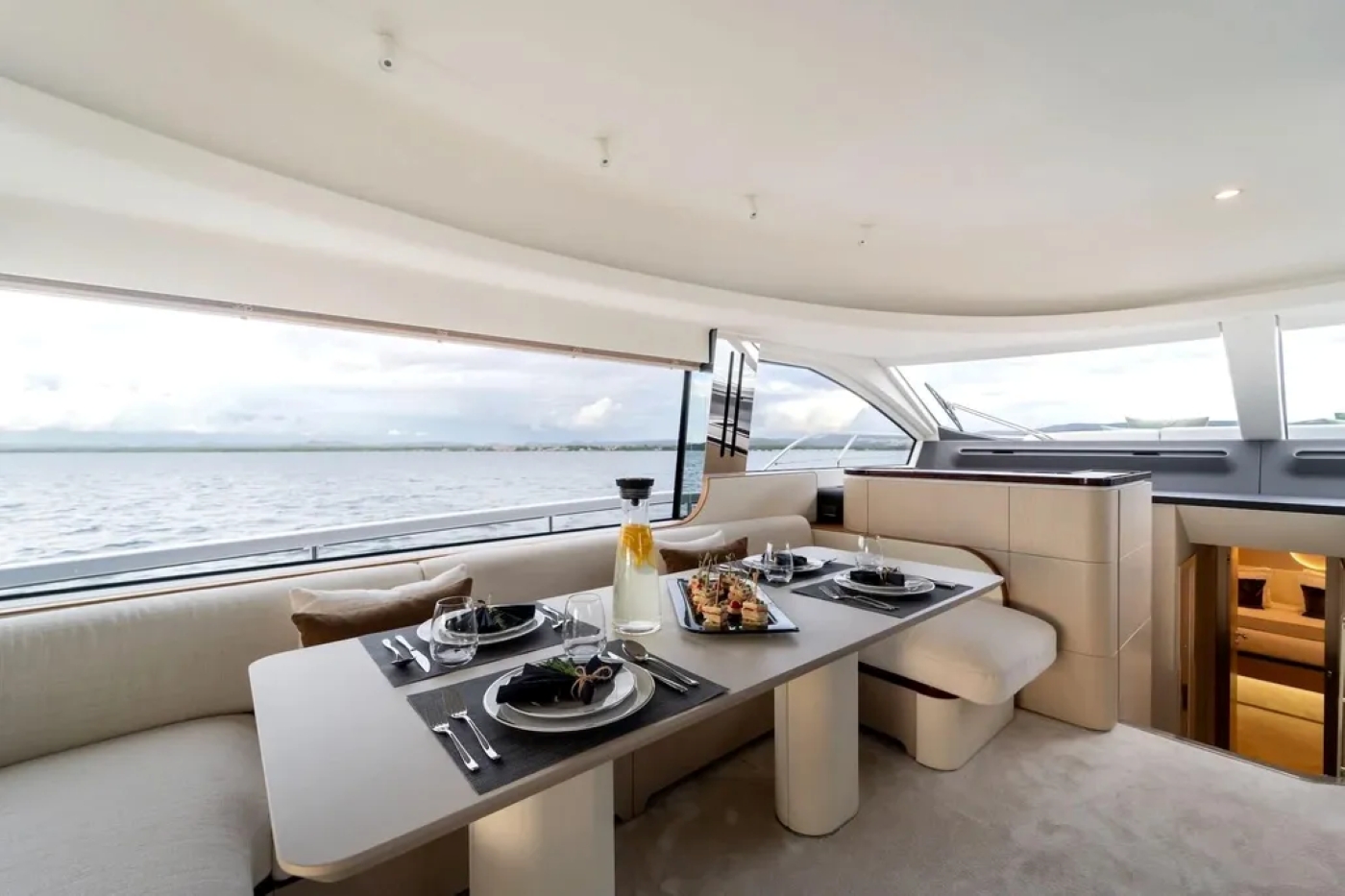 There is a choice of entertainment space on the flybridge and main deck including dining, lounge and sunbathing spaces.