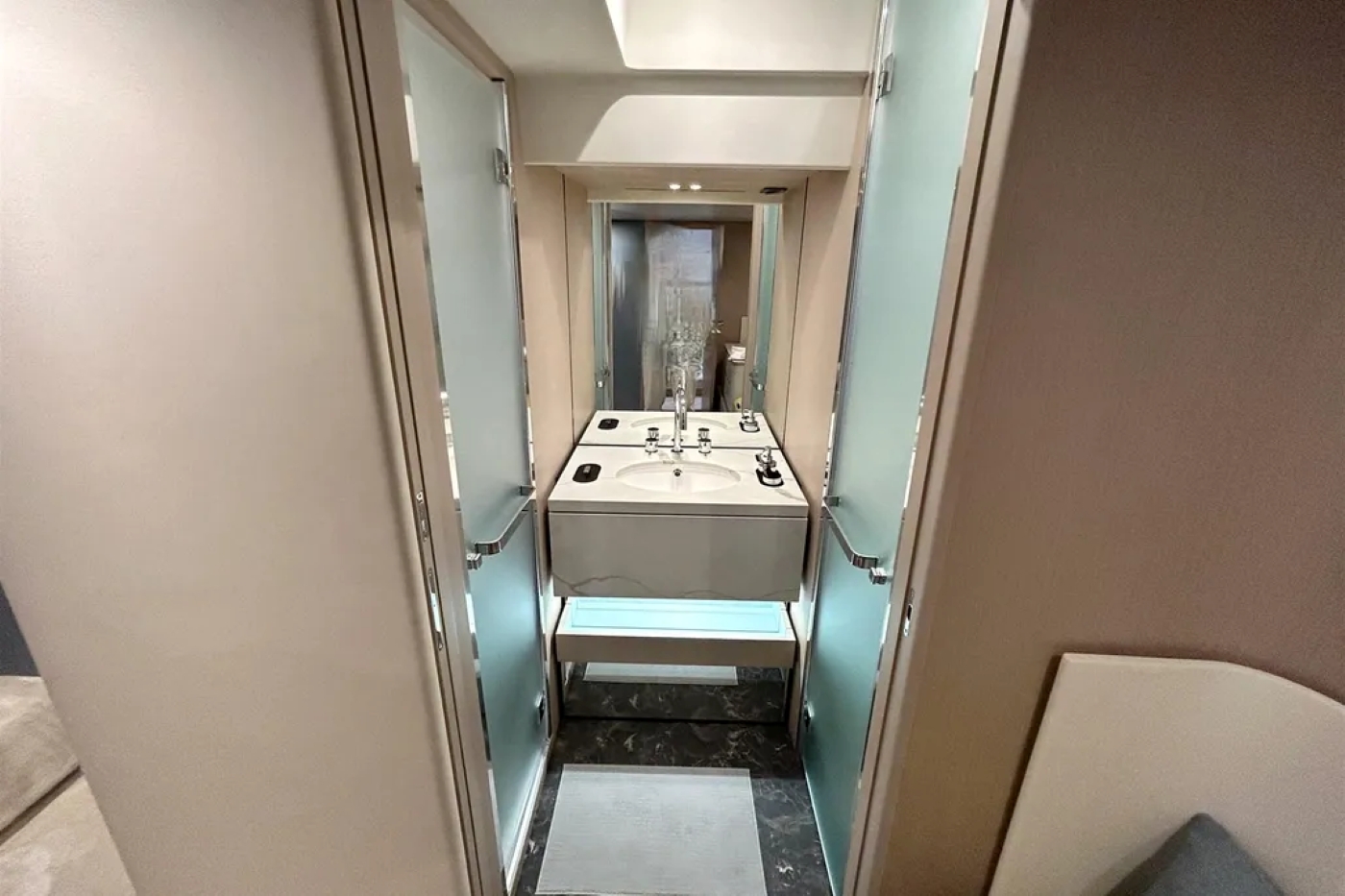 The lower deck guest suites are configured as a full beam master and forward VIP with ensuites and a starboard twin and port side bunk cabin which share a bathroom. The cabins share the same light and neutral décor and are extremely welcoming.