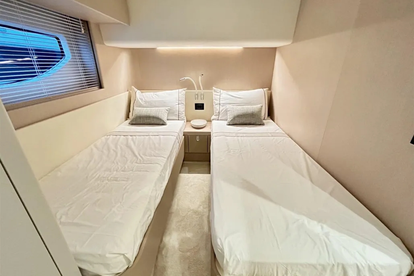 She can accommodate up to eight guests in four suites with additional cabins for the two crew members.