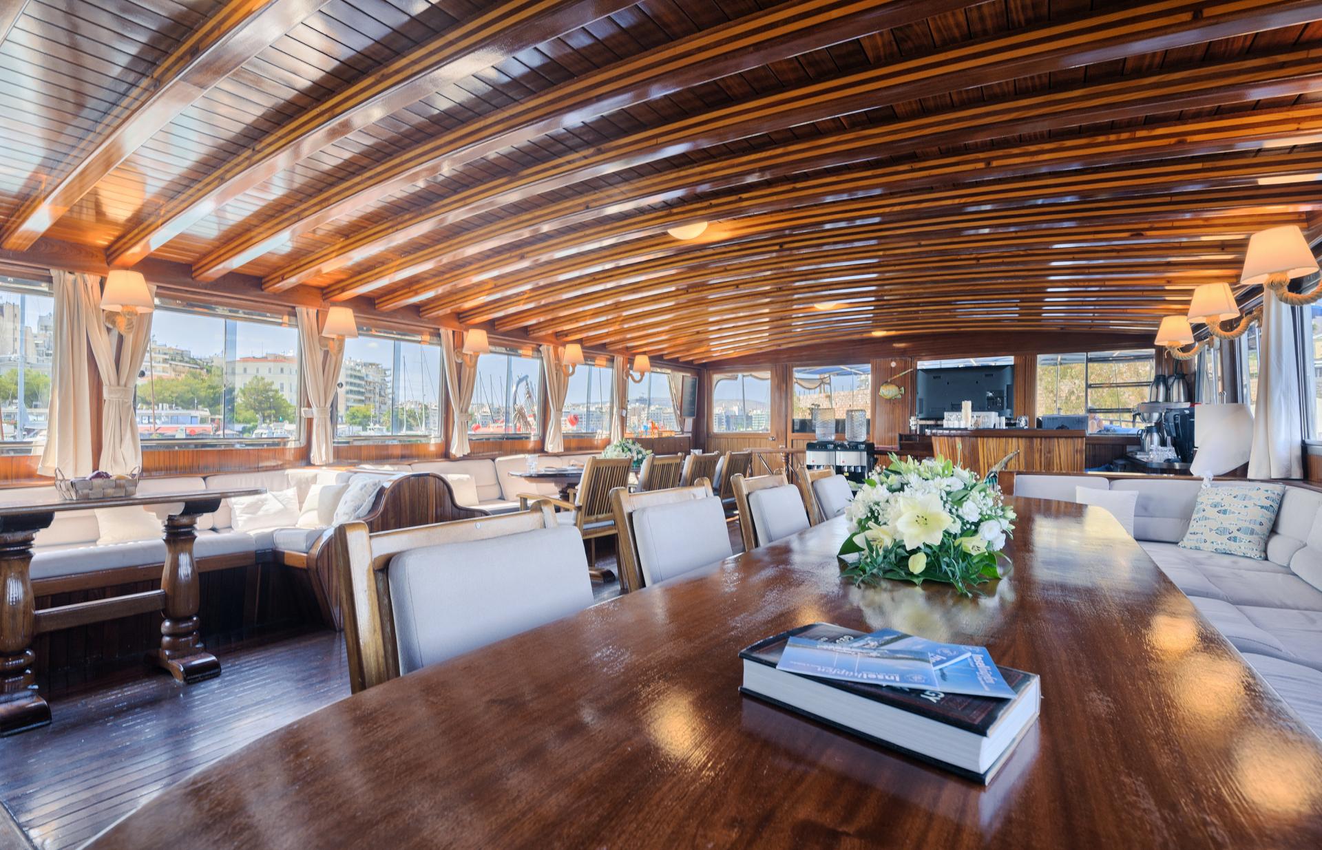 The interior is fitted with classic dark wood panelling and the main salon has three spacious dining/lounge settings with clear views from the panoramic windows.