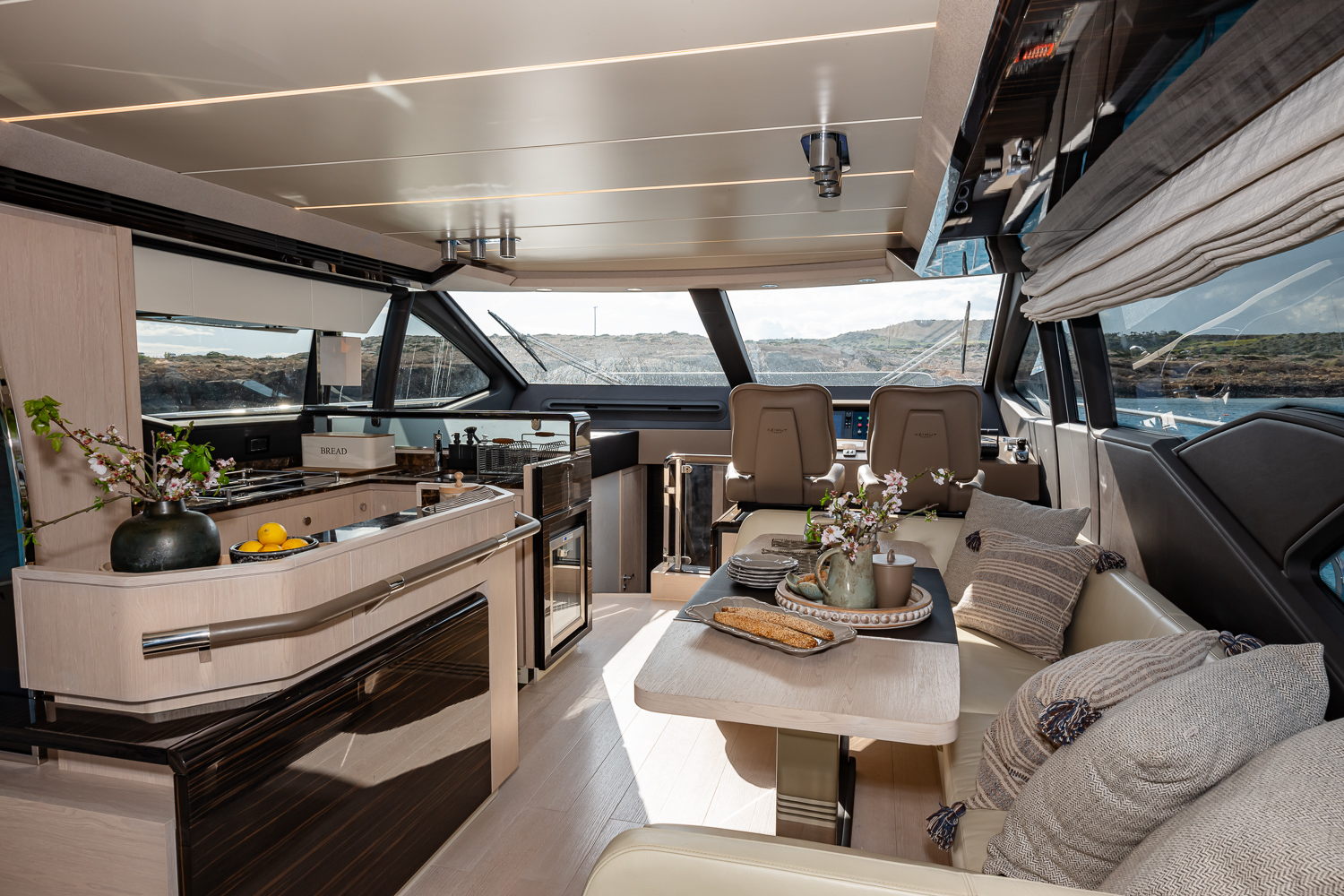 This flybridge yacht provides fabulous al fresco entertainment settings for guests with lounge space, dining and sunbathing.