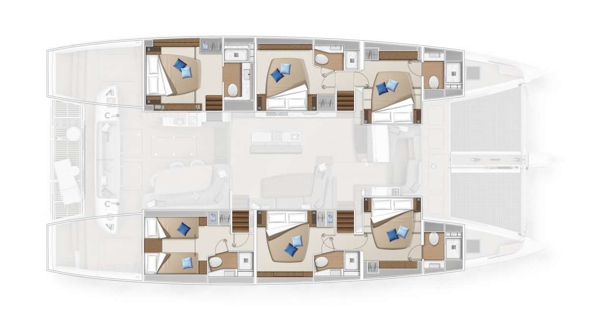 Sailing yacht WHITE CAPS is a 19.50 m (64') Lagoon catamaran launched in 2021 offering a vast flybridge with a semi-open hard roof and sociable aft cockpit. She can accommodate up to ten guests in six suites and is crewed by a team of four.
