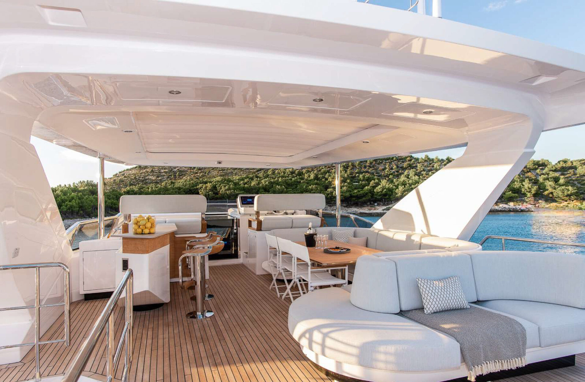 D&Y): ~Spacious al fresco entertaining ~Designer interior ~Loads of water toys ~Main deck master suite ~At anchor and underway stabilisers ~Air conditioning ~WiFi
