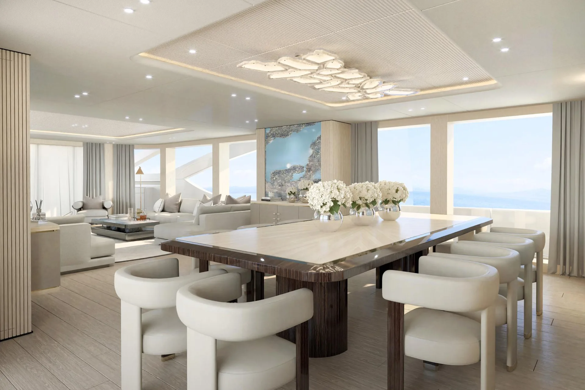 The yacht has an understated design and interiors in shades of sand, offering an unrivalled luxury experience. The upper deck boasts a sky lounge aft with the bridge and captain’s accommodation forward.