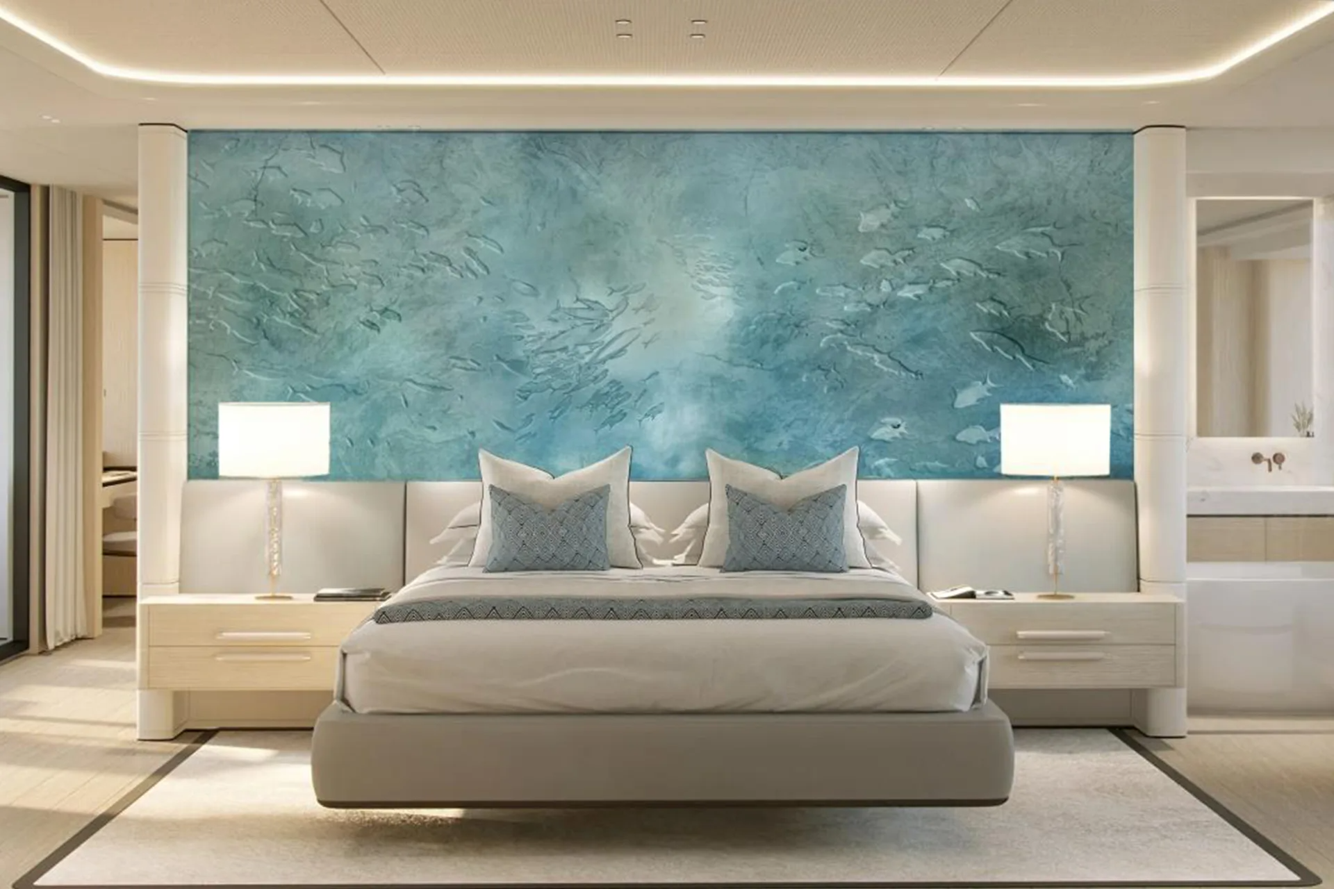 Amidships on this level is a grand lobby used to display a collection of artworks and forward is the master suite.