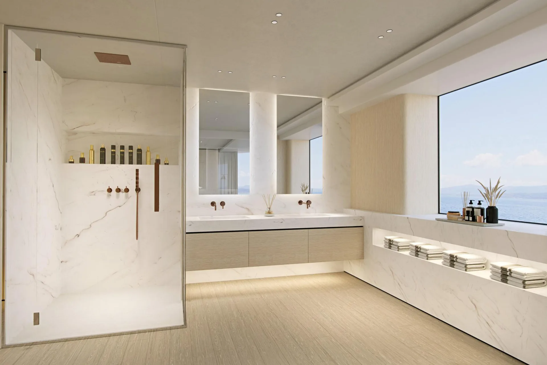 Amidships on this level is a grand lobby used to display a collection of artworks and forward is the master suite.