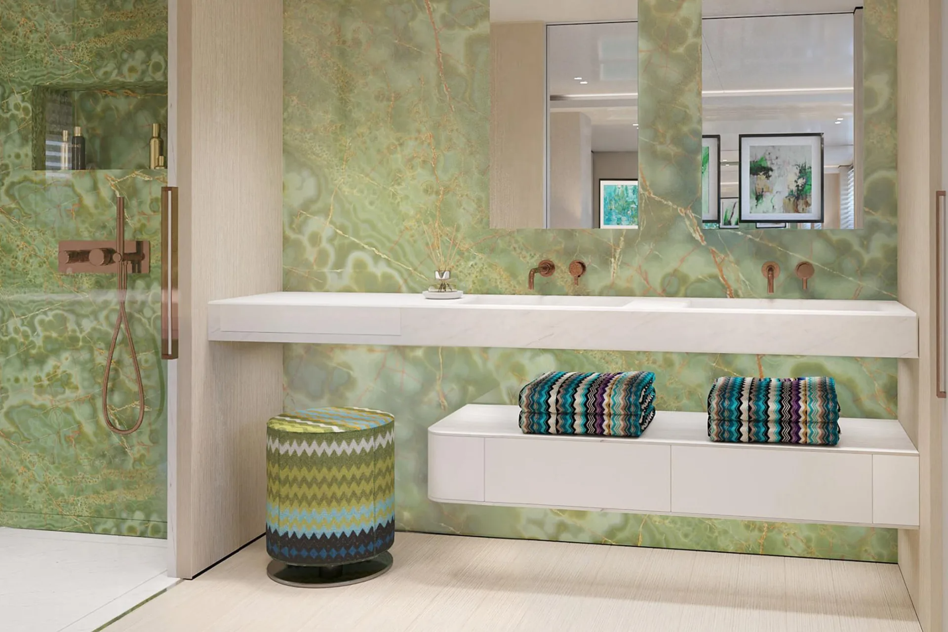 Amidships on this level is a grand lobby used to display a collection of artworks and forward is the master suite.