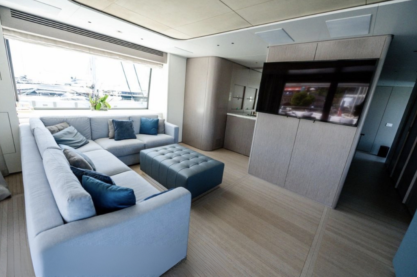 The interior of the yacht was designed by Bonetti / Kozerski architecture and features light wood finishes with neutral soft furnishings across a sky lounge and main salon with both lounge and dining room.