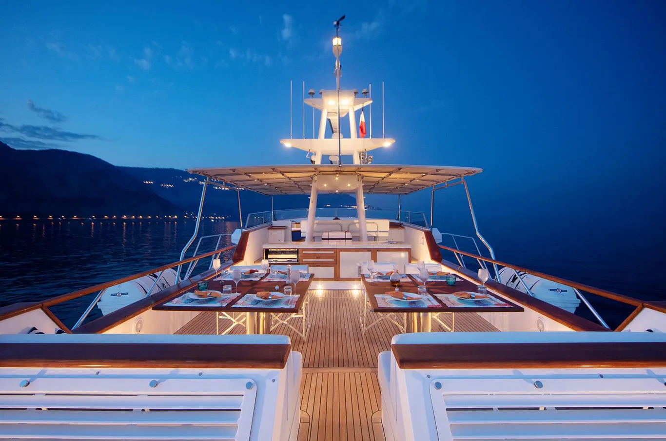 Her sociable upper deck provides great entertainment space, and she can accommodate up to ten guests in five luxury staterooms. A 5-person crew are on board to ensure charters run smoothly.