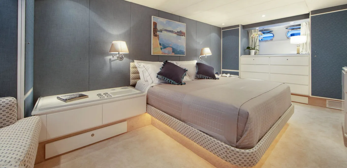 The stylish guest accommodation is on the lower deck and is configured as two equal sized full beam masters – one forward and one aft, one double suite and two twins. All the suites benefit from the luxury and privacy of ensuite bathroom facilities.