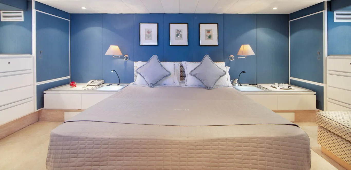 The stylish guest accommodation is on the lower deck and is configured as two equal sized full beam masters – one forward and one aft, one double suite and two twins. All the suites benefit from the luxury and privacy of ensuite bathroom facilities.