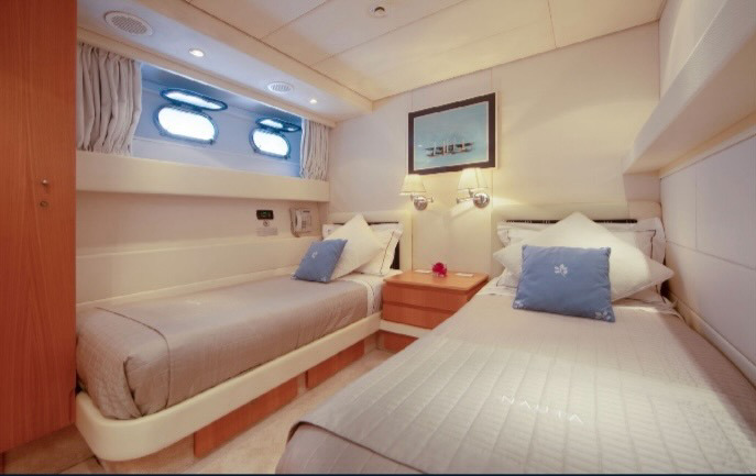 The stylish guest accommodation is on the lower deck and is configured as two equal sized full beam masters – one forward and one aft, one double suite and two twins. All the suites benefit from the luxury and privacy of ensuite bathroom facilities.