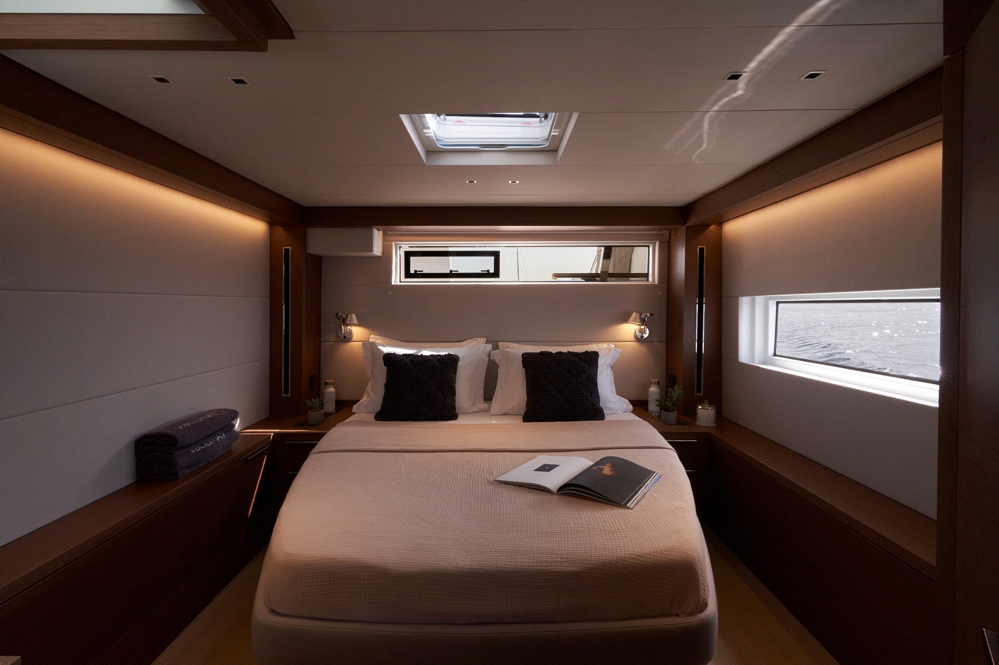 The six-cabin layout can accommodate ten guests and four crew in five double suites and one twin – the crew use the twin and the additional crew cabins. All the suites benefit from the luxury and privacy of ensuite bathroom facilities with the master offering private access from the aft cockpit.