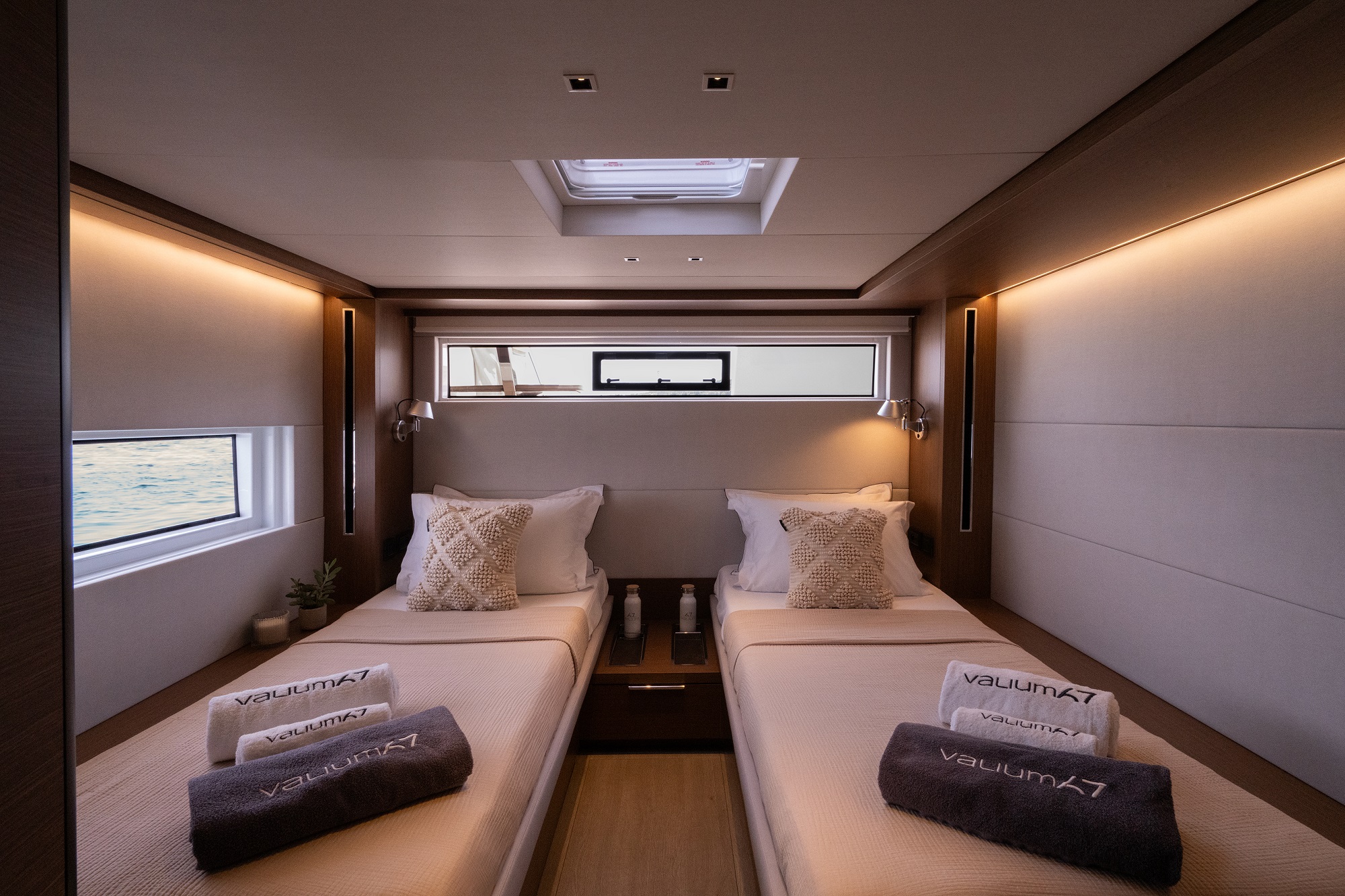 The six-cabin layout can accommodate ten guests and four crew in five double suites and one twin – the crew use the twin and the additional crew cabins. All the suites benefit from the luxury and privacy of ensuite bathroom facilities with the master offering private access from the aft cockpit.