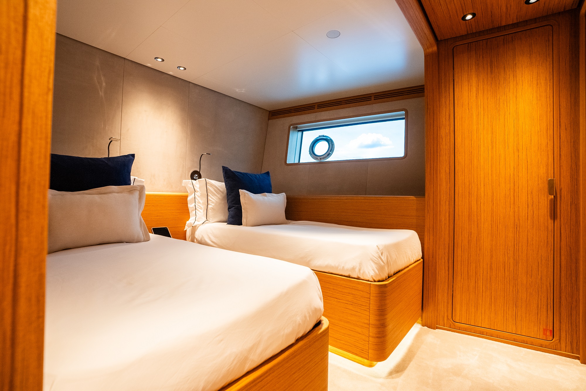She can accommodate up to ten guests in five suite and has a crew of five on board.