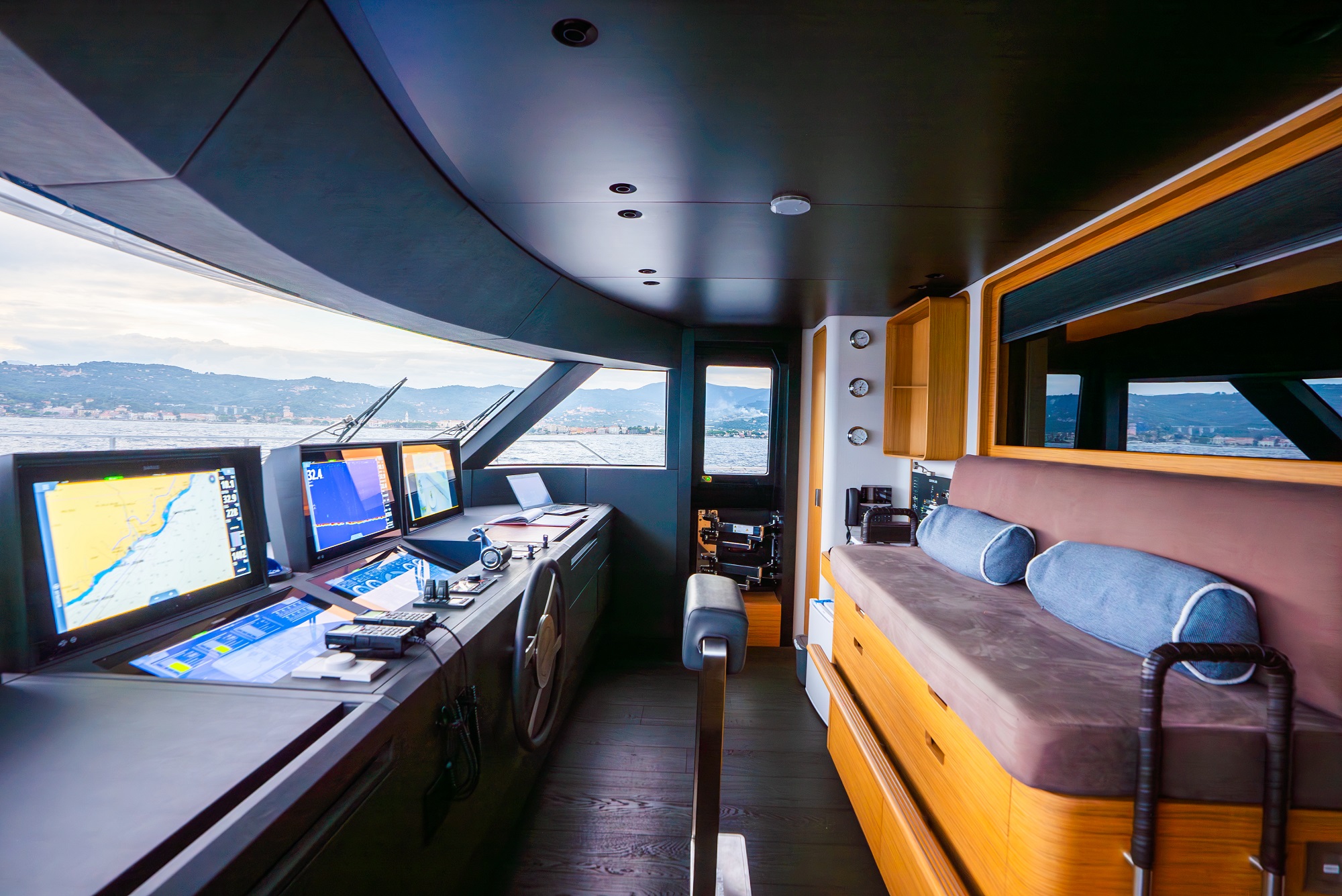 The upper deck aft is dedicated to al fresco dining and includes a huge table and long day bed/sofa across the full beam. There is an alternative deck lounge on the foredeck plus more seating on the main deck aft.