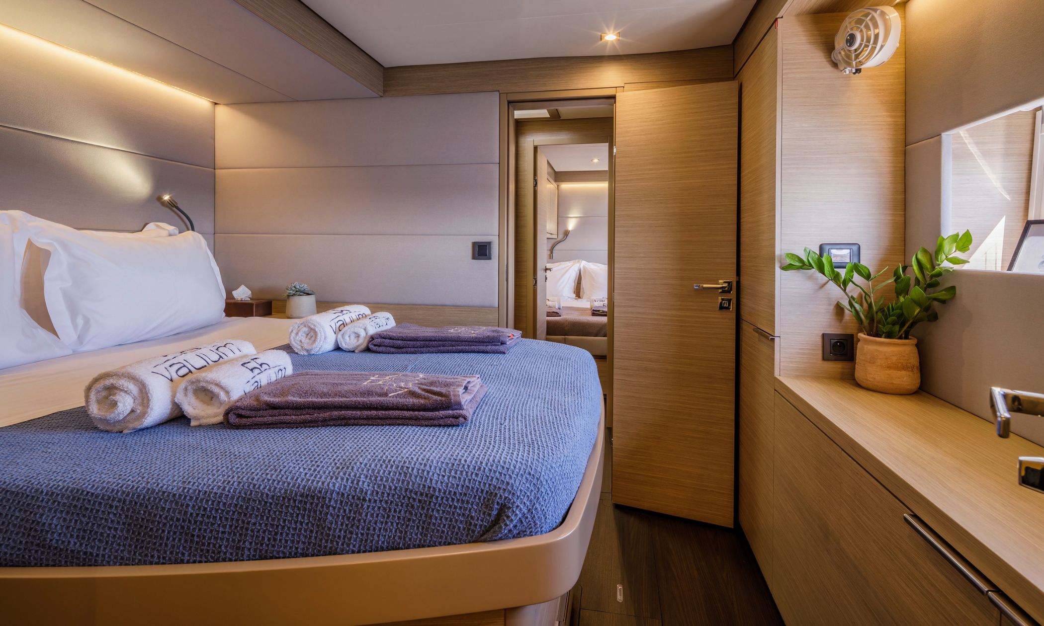 She can accommodate up to ten guests in five suites who will be looked after by a professional crew of three.