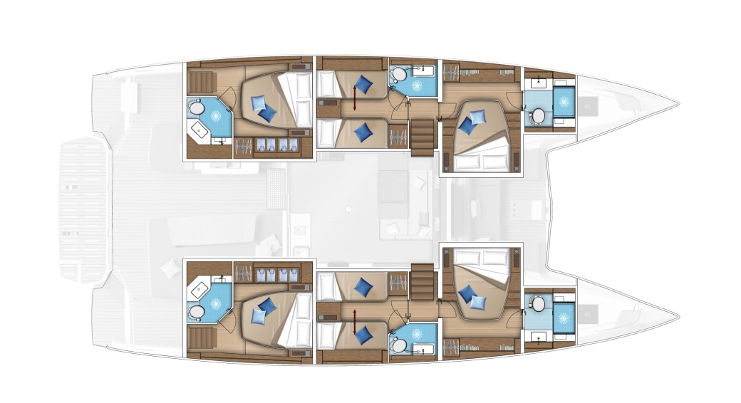 The guest accommodation is on the lower deck across both hulls. There are five guest suites and one crew cabin ...