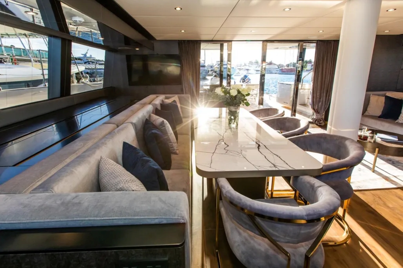 The interior décor is a wonderful exploration of contemporary cool, with soft grey tones, marble and wood finishes and luxurious upholstery across the light-filled main salon and lower deck guest suites.