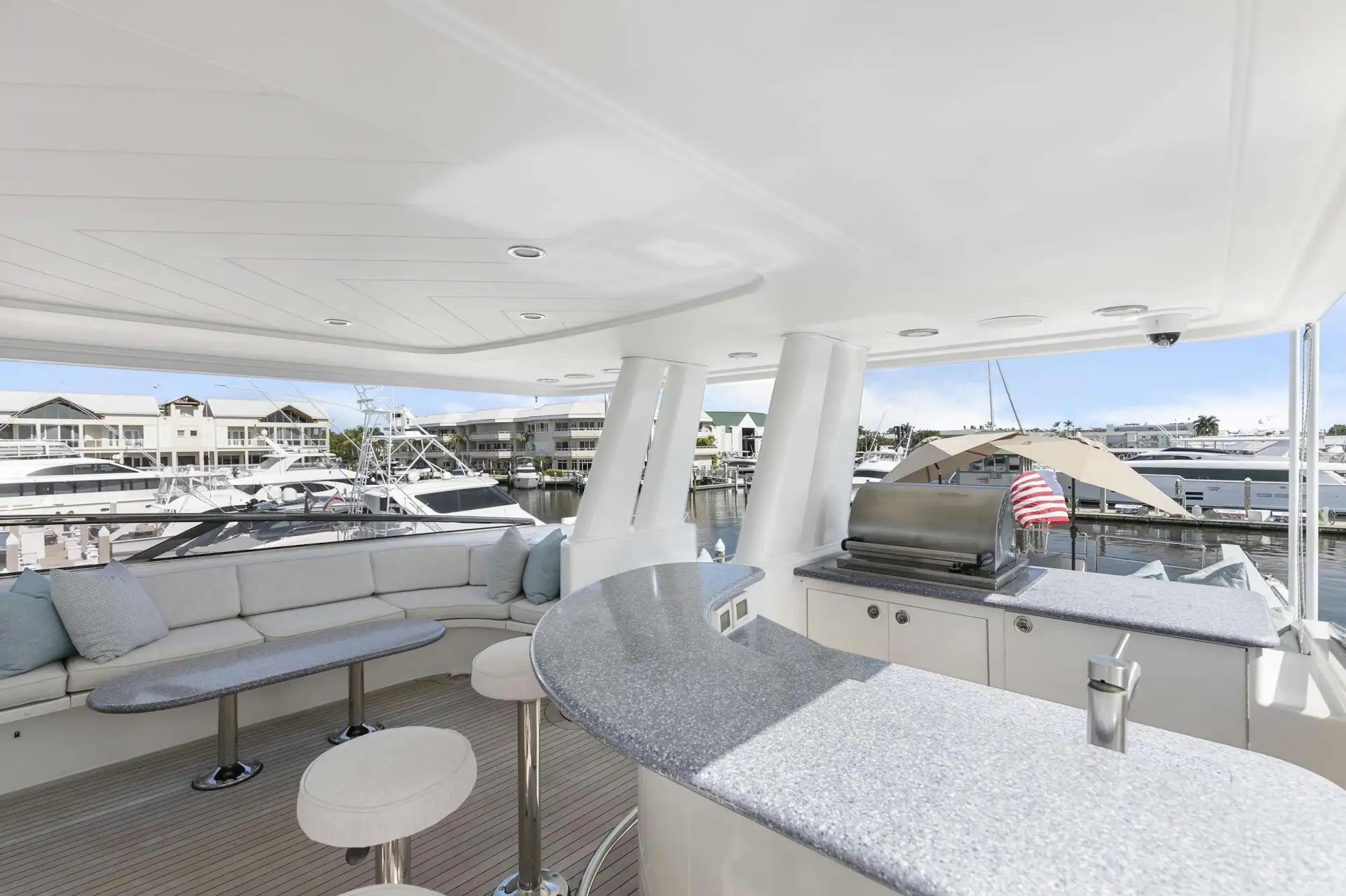 Spiral stairs to starboard lead up to the sun deck and curved steps on either side lead down to the large swim platform.