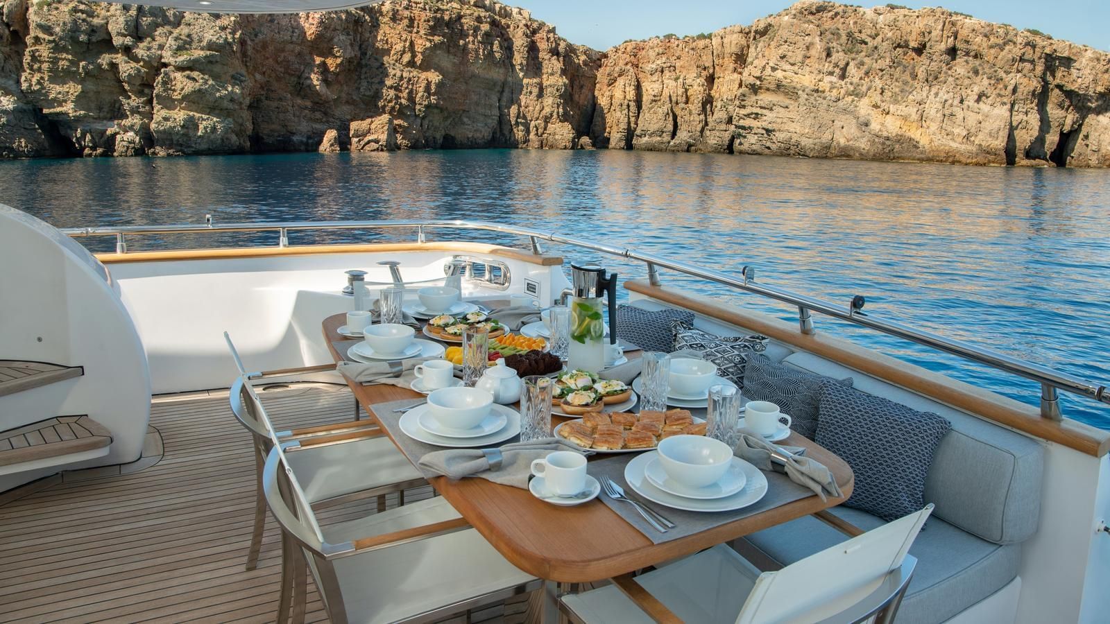 There is plenty of al fresco deck space and four ensuite cabins plus an onboard crew of four.