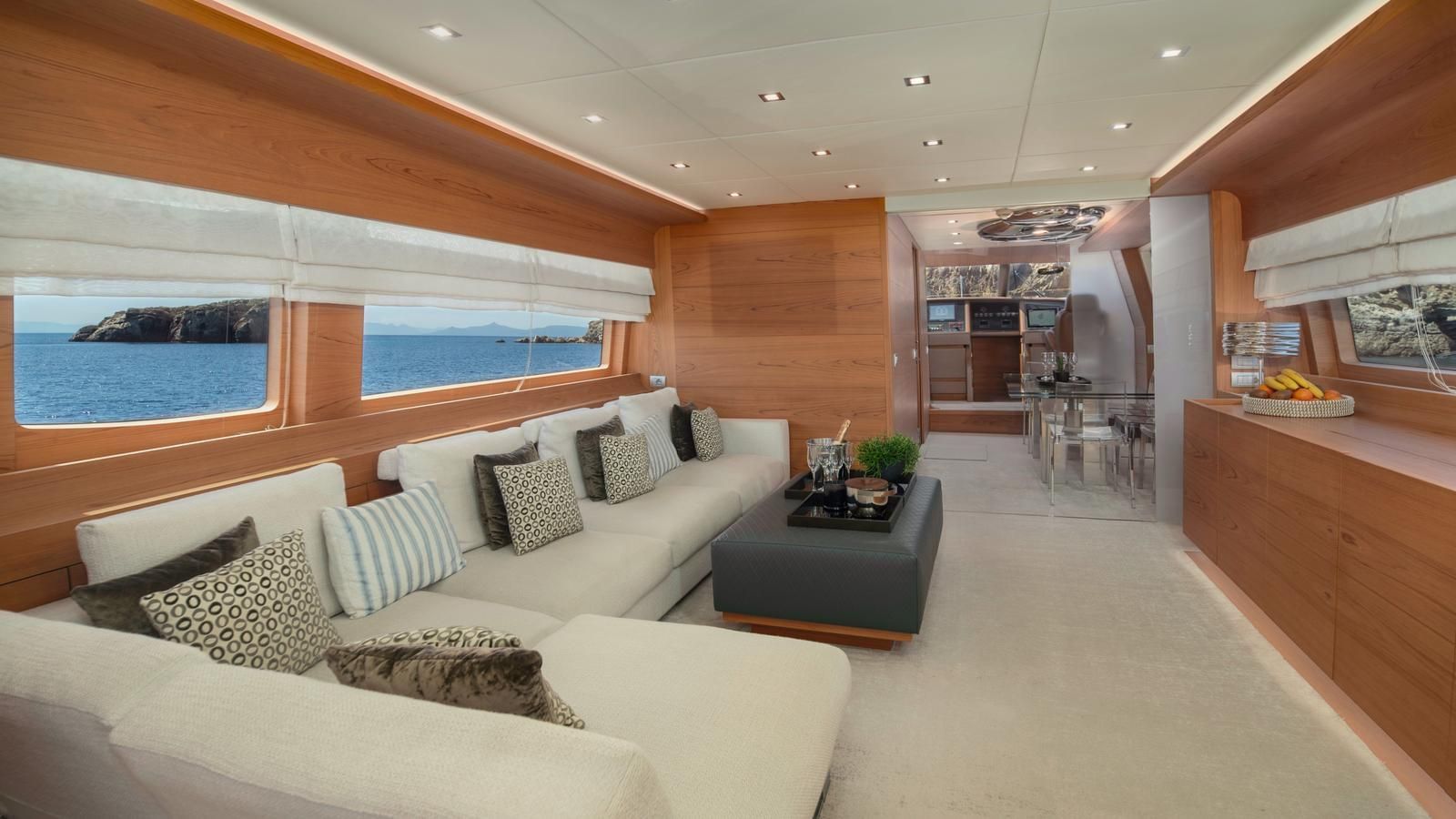 The main salon is light and bright with large windows and a neutral décor. The space is configured with a comfortable L-shaped sofa and coffee table and a forward dining setting adjacent to the separate galley. Further forward is the bridge with captain’s seats and companion seating.