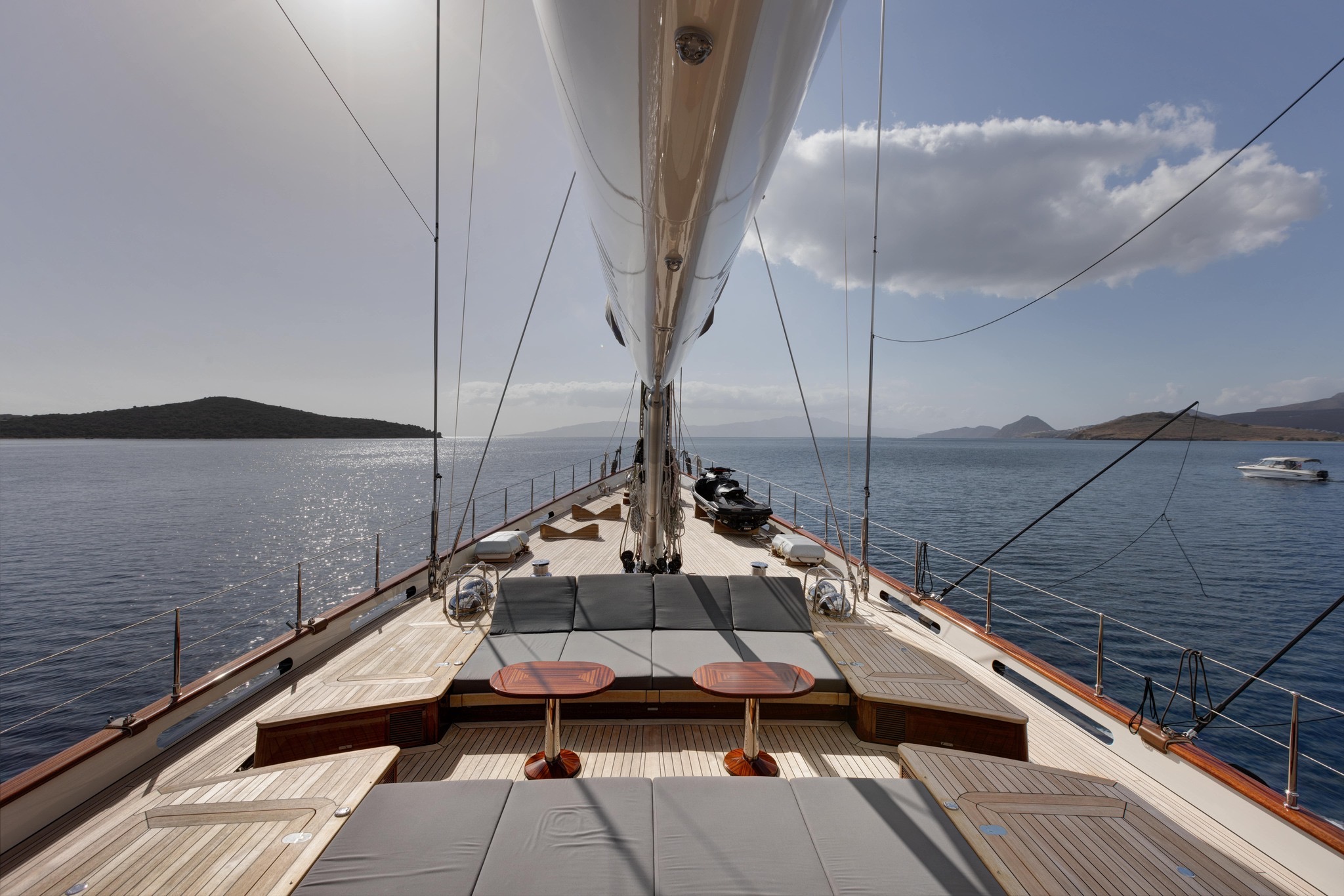 At 47.5m (115’10”) she offers ample deck space and a refined interior to provide smooth sailing charters for up to 12 guests in five suites. There is also a crew of eight on board to ensure guests are looked after throughout the charter.