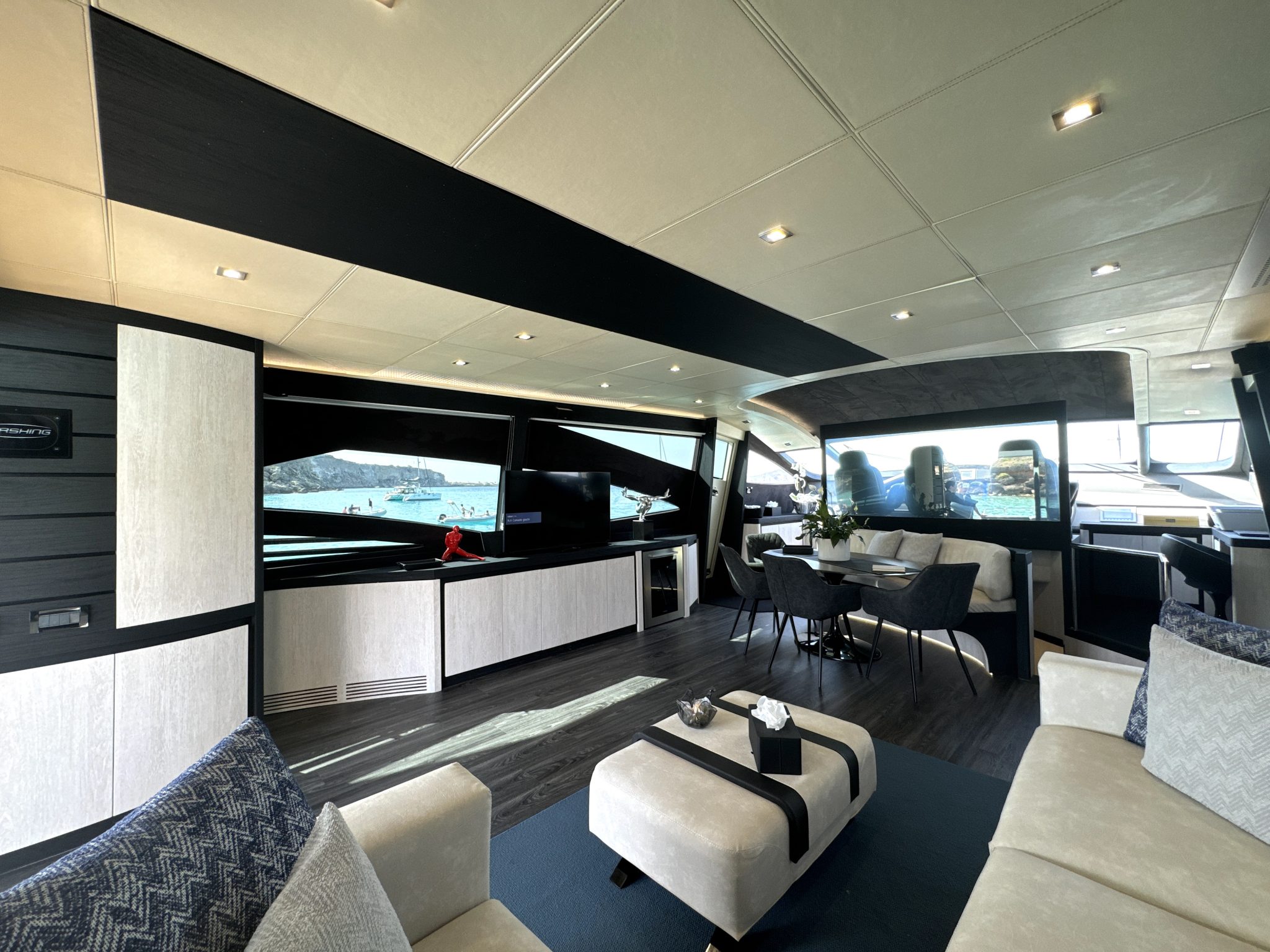 There is a lounge to aft and circular dining setting forward with a curved bench seat, round table and moveable chairs. Further forward is the bridge with three captain’s chairs in an elevated position. The guest accommodation is on the lower deck and is configured as one master, one VIP, a double and twin.