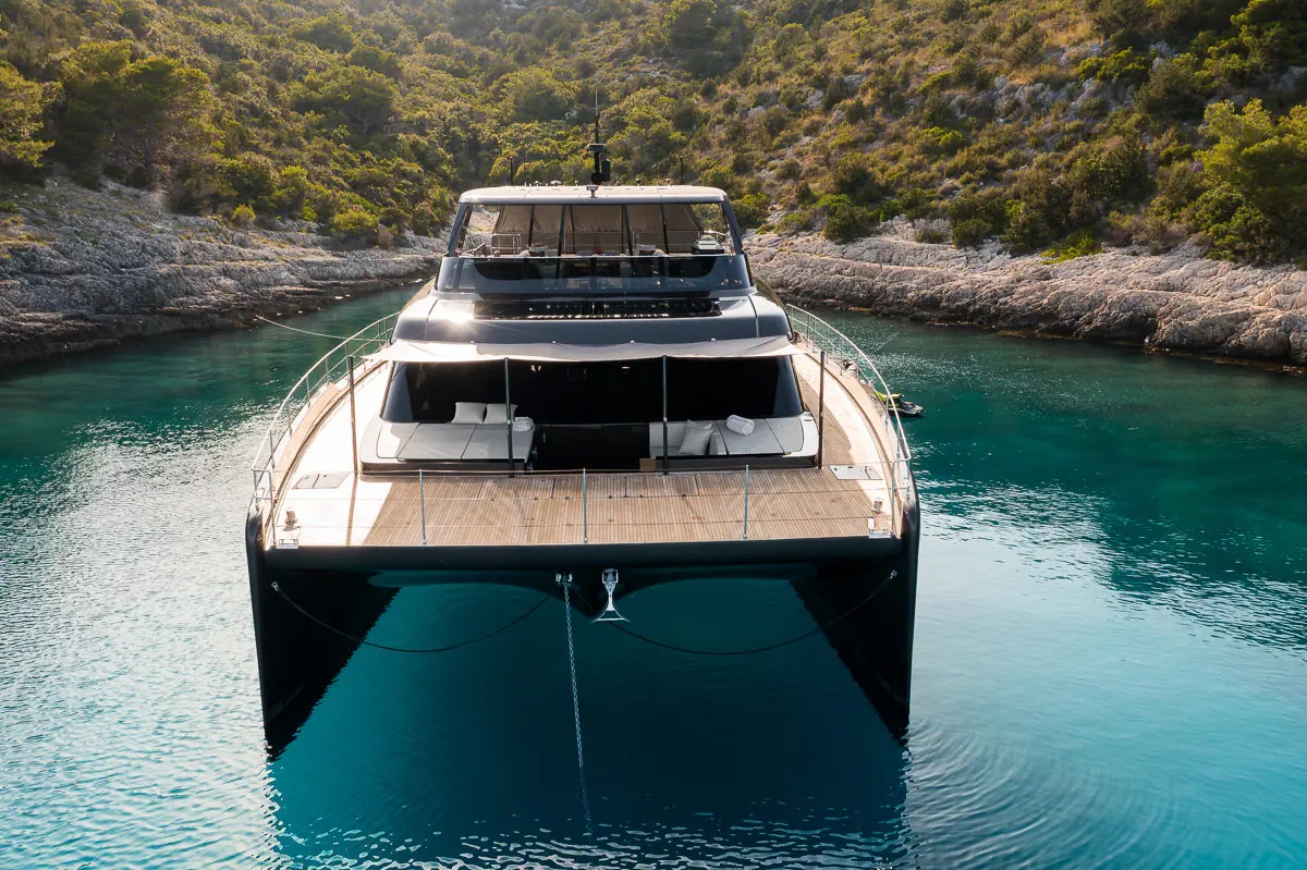 Motor yacht AMBER ONE is a 2023 built Sunreef Power 70 with a length of 21.30 m (69' 11") balancing premium comfort, great performance and advanced technology. She also boasts a head-turning anthracite grey hull and superstructure and can accommodate up to eight guests in four suites.