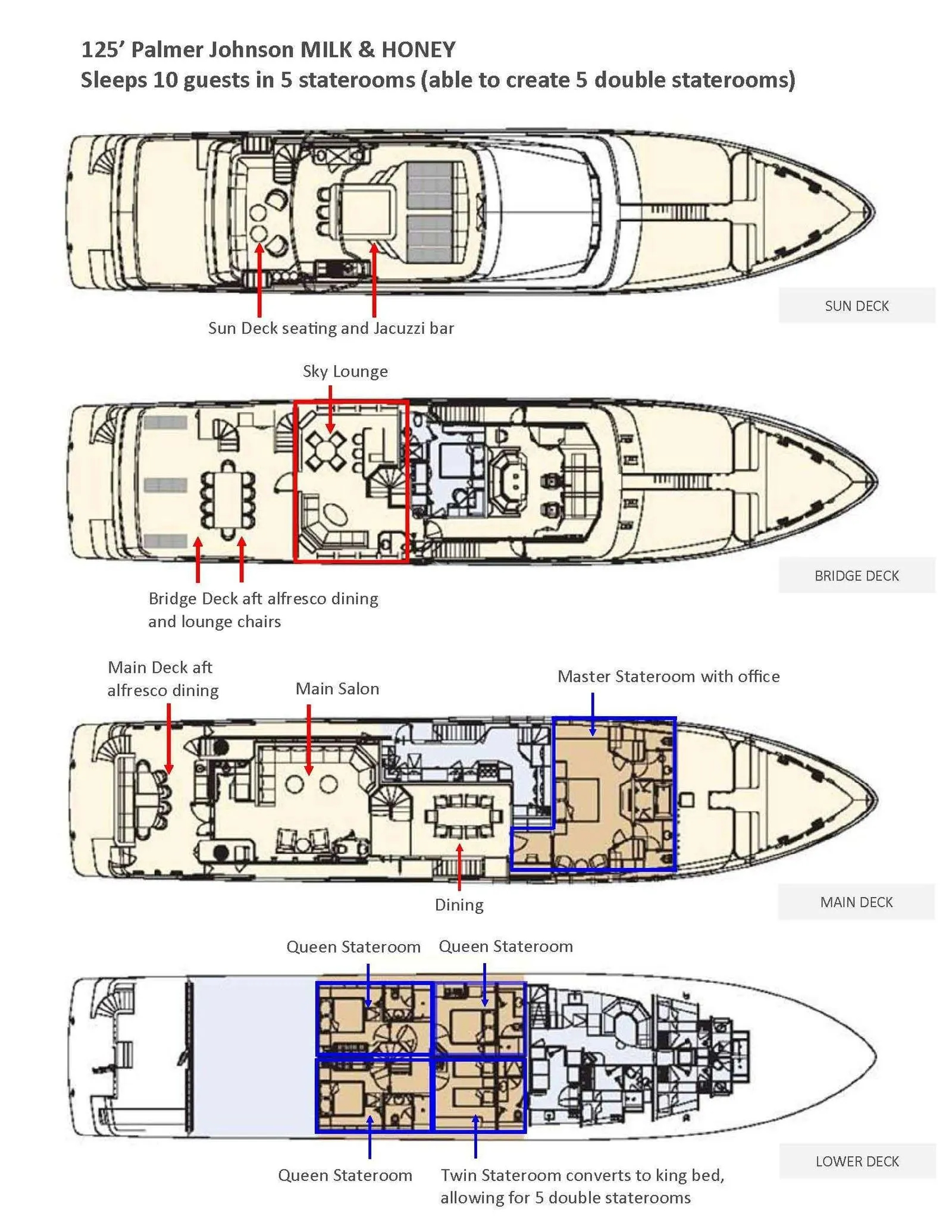 Luxury motor yacht LEVERAGE (ex MILK AND HONEY) is a 38.10 m (125') Palmer Johnson yacht built in 2003 and last refitted in 2023, which included a major overhaul of generators, engines and more. She has a semi-displacement Aluminium hull and comfort features including zero-speed stabilisers and full air-conditioning.