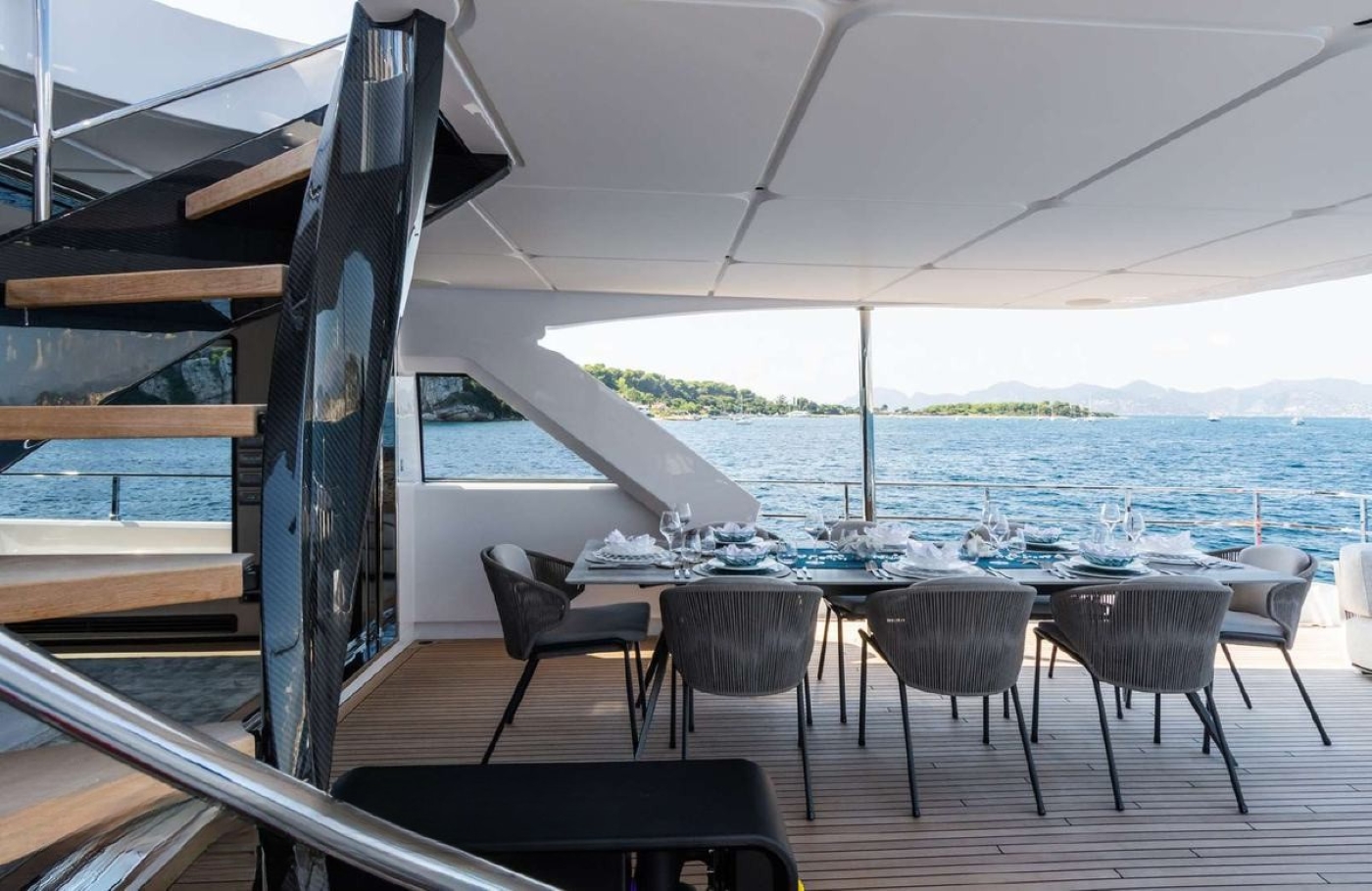 The bridge deck is a sociable hub with an eight-seater dining table under the overhang and a comfortable sofa placed aft and is perfect for pre-dinner drinks. The main deck aft is set up as an elegant lounge with another long sofa and occasional chairs surrounding a coffee table.